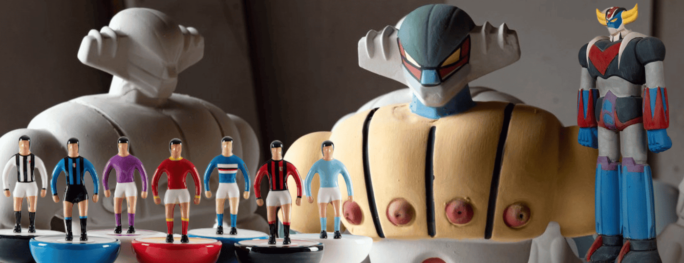 La collezione dedicata al Subbuteo rappresenta un connubio unico tra tradizione artigianale e nostalgia per il leggendario gioco da tavolo. Ogni miniatura, realizzata in ceramica e dipinta a mano, riproduce fedelmente le iconiche sagome dei giocatori, trasformandole in vere opere d’arte. Questo progetto nasce dalla passione della famiglia Puzzo per reinterpretare oggetti di culto in chiave artistica, dando nuova vita a un simbolo senza tempo.